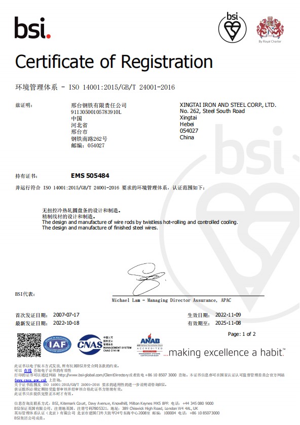 - Recently, Xingtai Steel successfully passed the certification of Safety and Environment System issued by BSI. Over the years, adhering to the philosophy of “reputation first, manegement first, people oriented and never stop”, Xingtai Steel constantly optimizes the system management, deeply impl…