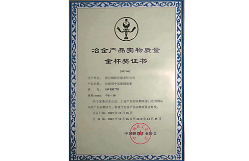 2007年12月,邢鋼冷鐓和冷擠壓用鋼盤條獲冶金產(chǎn)品實物質(zhì)量金杯獎。