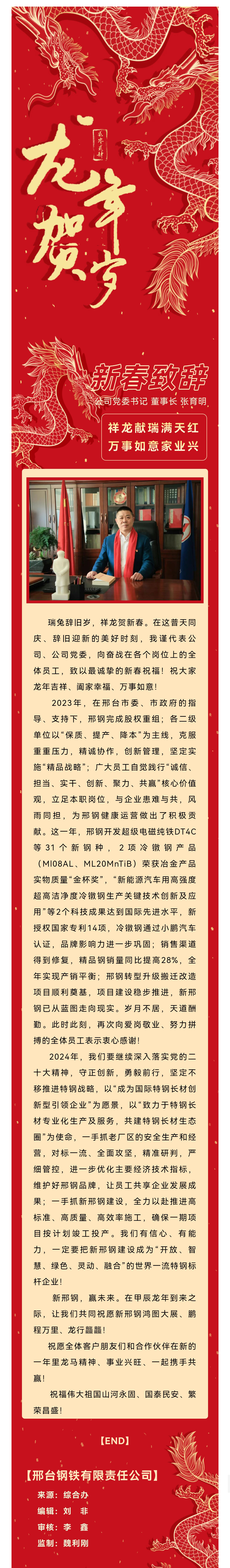 瑞兔辭舊歲,祥龍賀新春。在這普天同慶、辭舊迎新的美好時刻,我謹代表公司、公司黨委,向奮戰(zhàn)在各個崗位上的全體員工,致以最誠摯的新春祝福!祝大家龍年吉祥、闔家幸福、萬事如意!