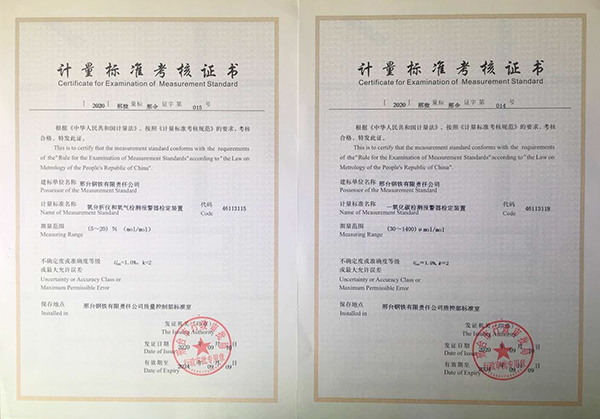 近日獲悉,邢鋼兩項(xiàng)企業(yè)最高計(jì)量標(biāo)準(zhǔn)《一氧化碳檢測(cè)報(bào)警器檢定裝置》和《氧分析儀和氧氣檢測(cè)報(bào)警器檢定裝置》獲得由邢臺(tái)市行政審批局頒發(fā)的《計(jì)量標(biāo)準(zhǔn)考核證書》。截至目前,邢鋼最高計(jì)量標(biāo)準(zhǔn)由15項(xiàng)增到17項(xiàng),專業(yè)范圍由5類增加到6類。
