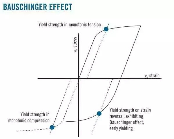 金屬材料經(jīng)過(guò)預(yù)先加載產(chǎn)生少量塑性變形(殘余應(yīng)變?yōu)?%~2%),卸載后再同向加載,規(guī)定殘余應(yīng)力(彈性極限或屈服強(qiáng)度 )增加;反向加載,規(guī)定殘余應(yīng)力降低(特別是彈性極限在反向加載時(shí)幾乎降低到零)的現(xiàn)象,稱(chēng)為包申格效應(yīng)。