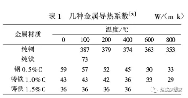 2000年以來(lái)銅冷卻壁以其良好的導(dǎo)熱能力和形成渣皮能力在我國(guó)高爐上得到廣泛的使用,目前全國(guó)約200座以上的高爐采用銅冷卻壁,尤其是在爐腹、爐腰和爐身下部等熱負(fù)荷較高的區(qū)域。高爐冷卻壁主要包括鑄鐵和純銅,另外還出現(xiàn)過(guò)鑄鋼冷卻壁。鑄鐵冷卻壁抗熱震性能差、導(dǎo)熱系數(shù)低。另外,其冷卻水管是鑄入鑄鐵本體內(nèi)的,由于材質(zhì)和膨脹系數(shù)的不同,形成氣隙層,而影響了傳熱。這些缺陷限制了鑄鐵冷卻壁的進(jìn)一步發(fā)展。因此,從上世紀(jì)70年代歐洲開(kāi)發(fā)和使用了銅冷卻壁,得到較好的效果。表1為幾種不同金屬導(dǎo)熱系數(shù),可以看出純銅的導(dǎo)熱系數(shù)遠(yuǎn)優(yōu)于其他材料。