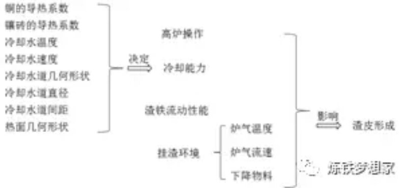 對(duì)于爐腹、爐腰及爐身下部等高熱負(fù)荷區(qū)域,無(wú)論是鑄鐵冷卻壁還是銅冷卻壁,渣皮的保護(hù)作用對(duì)冷卻系統(tǒng)的長(zhǎng)壽至關(guān)重要。冷卻壁熱面存在穩(wěn)定渣皮時(shí),塊狀帶物料、熔融渣鐵及高溫煤氣等不能直接接觸冷卻壁壁體,從而減少磨損、渣鐵侵蝕、“氫病”及有害元素等問(wèn)題的發(fā)生,大幅提高冷卻壁壽命。渣皮的形成過(guò)程受多方面因素影響,如圖1所示。