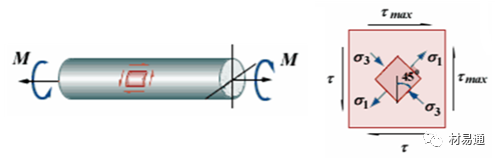 純扭轉(zhuǎn)時圓試樣的表面處于純剪應力狀態(tài),與桿軸成±45º角的螺旋面上分別作用著兩個主應力: σ1、σ3 并與最大剪應力τmax絕對值數(shù)值相等。因此試樣的斷口角度直接顯示材料是拉斷還是剪斷、材料自身抗拉、抗剪能力的強弱由此得到直接地比較。