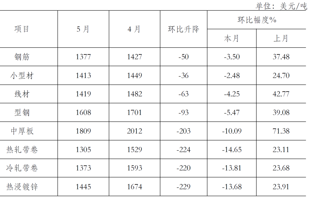 5月末,鋼鐵協(xié)會(huì)監(jiān)測(cè)的八大鋼材品種價(jià)格均有所下降。其中,熱軋卷板和冷軋薄板繼續(xù)下降,且降幅較上月有所加大,環(huán)比分別下降302元/噸和196元/噸;高線、三級(jí)鋼筋、角鋼、中厚板、鍍鋅板和熱軋無(wú)縫管價(jià)格由升轉(zhuǎn)降,環(huán)比分別下降272元/噸、298元/噸、188元/噸、154元/噸、162元/噸和91元/噸。(見(jiàn)下表)