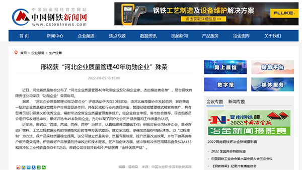 近日,河北省質(zhì)量協(xié)會(huì)公布了“河北企業(yè)質(zhì)量管理40年功勛企業(yè)及功勛企業(yè)家、杰出推進(jìn)者名單”,邢臺(tái)鋼鐵有限責(zé)任公司榮獲“功勛企業(yè)”榮譽(yù)稱號(hào)。