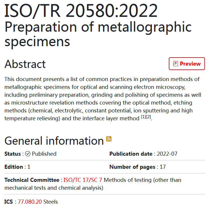 ISO/TR 20580:2022 Preparation of metallographic specimens《金相試樣的制備》國際標準近日批準發(fā)布,這是由我國主導(dǎo)制定的又一項金相檢驗領(lǐng)域國際標準。