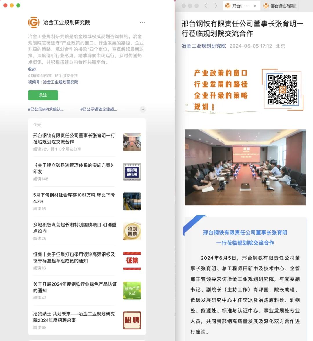 2024年6月5日,邢臺鋼鐵有限責任公司黨委書記、董事長張育明在總工程師兼董事長、總經(jīng)理助理田新中及技術(shù)中心、企管部相關(guān)負責人的陪同下,到訪冶金工業(yè)規(guī)劃研究院,與黨委副書記、副院長(主持工作)肖邦國,院長助理、低碳發(fā)展研究中心主任李冰及冶煉原料處、軋鋼處、能源處、標準與認證中心、事業(yè)發(fā)展處專業(yè)人員,共同就邢鋼高質(zhì)量發(fā)展及深化雙方合作進行座談。