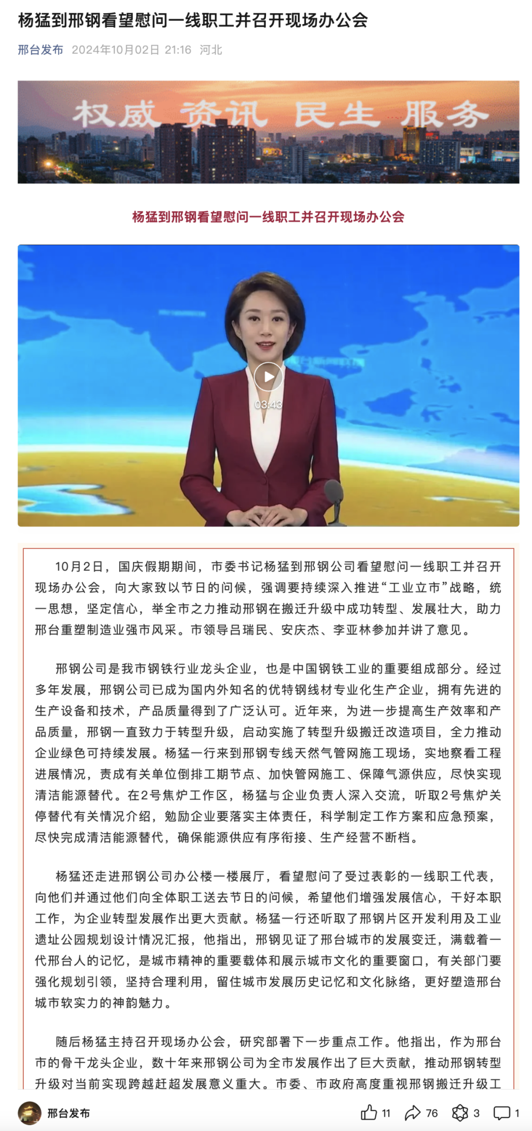 10月2日,國慶假期期間,市委書記楊猛到邢鋼公司看望慰問一線職工并召開現(xiàn)場辦公會(huì),向大家致以節(jié)日的問候,強(qiáng)調(diào)要持續(xù)深入推進(jìn)“工業(yè)立市”戰(zhàn)略,統(tǒng)一思想,堅(jiān)定信心,舉全市之力推動(dòng)邢鋼在搬遷升級(jí)中成功轉(zhuǎn)型、發(fā)展壯大,助力邢臺(tái)重塑制造業(yè)強(qiáng)市風(fēng)采。市領(lǐng)導(dǎo)呂瑞民、安慶杰、李亞林參加并講了意見。