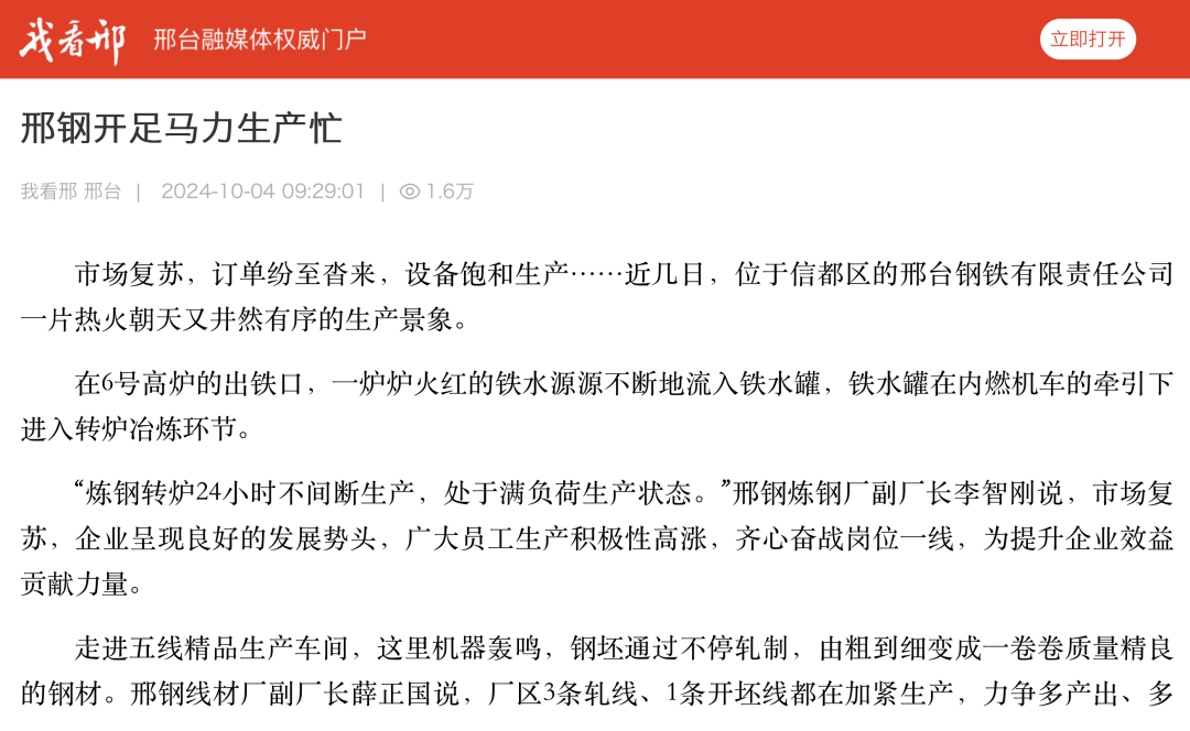 在 6 號(hào)高爐的出鐵口,一爐爐火紅的鐵水源源不斷地流入鐵水罐,鐵水罐在內(nèi)燃機(jī)車的牽引下進(jìn)入轉(zhuǎn)爐冶煉環(huán)節(jié)。“煉鋼轉(zhuǎn)爐 24 小時(shí)不間斷生產(chǎn), 處于滿負(fù)荷生產(chǎn)狀態(tài)。”邢鋼煉鋼廠副 廠長(zhǎng)李智剛說,市場(chǎng)復(fù)蘇,企業(yè)呈現(xiàn)良好的發(fā)展勢(shì)頭,廣大員工生產(chǎn)積極性高漲,齊心奮戰(zhàn)崗位一線,為提升企業(yè)效益貢獻(xiàn)力量。走進(jìn)五線精品生產(chǎn)車間,這里機(jī)器轟鳴,鋼坯通過不停軋制,由粗到細(xì)變成一卷卷質(zhì)量精良的鋼材。邢鋼線材廠副廠長(zhǎng)薛正國(guó)說,廠區(qū) 3 條軋線、 1 條開坯線都在加緊生產(chǎn),力爭(zhēng)多產(chǎn) 出、多收益。近年來,邢鋼致力于轉(zhuǎn)型升級(jí)促進(jìn)高質(zhì)量發(fā)展,專注于工業(yè)新材料的研發(fā)制造,公司優(yōu)特鋼比例達(dá) 100%,高新產(chǎn)品達(dá) 70%以上,擁有冷鐓鋼、純鐵、彈簧鋼等 18 大類 600 多個(gè)鋼種 3500 多種產(chǎn)品,廣泛應(yīng)用于汽車、大跨 度橋梁、鐵路等國(guó)家優(yōu)先發(fā)展的領(lǐng)域。高品質(zhì)特鋼產(chǎn)品讓邢鋼不斷贏得市場(chǎng)認(rèn)可。前不久,在上海國(guó)際緊固件 工業(yè)博覽會(huì)和 2024 印尼雅加達(dá)東南亞緊固件專業(yè)展上,邢鋼與巴西、越南等多個(gè)國(guó)家的企業(yè)達(dá)成合作意向;邢鋼的“新能源汽車用高強(qiáng)度超高潔凈度冷鐓鋼技術(shù)創(chuàng)新及應(yīng)用”項(xiàng)目經(jīng)河北省質(zhì)量 文化協(xié)會(huì)選拔、中國(guó)質(zhì)量協(xié)會(huì)推薦,成功入圍 2024 年度國(guó)際質(zhì)量創(chuàng)新大賽。“邢鋼專注高端鋼材生產(chǎn),市場(chǎng)競(jìng)爭(zhēng)力強(qiáng),訂單充足,未來一個(gè)月的訂單已經(jīng)基本排滿,多種規(guī)格產(chǎn)品訂單量增長(zhǎng)。”在五線中控室,薛正國(guó)在電腦上翻看排單表,信心十足地說“,在市場(chǎng)大環(huán)境穩(wěn)定的情況下,訂單量有保證。”在采訪中,五線精品生產(chǎn)車間主任張志斌說,火力全開的生產(chǎn)景象令人振奮,他將把自己 20 年的工作經(jīng)驗(yàn)運(yùn)用到生產(chǎn)中去,推動(dòng)鋼材標(biāo)準(zhǔn)化生 產(chǎn),滿足客戶的需求,不斷提升產(chǎn)品質(zhì)量和邢鋼品牌滿意度。