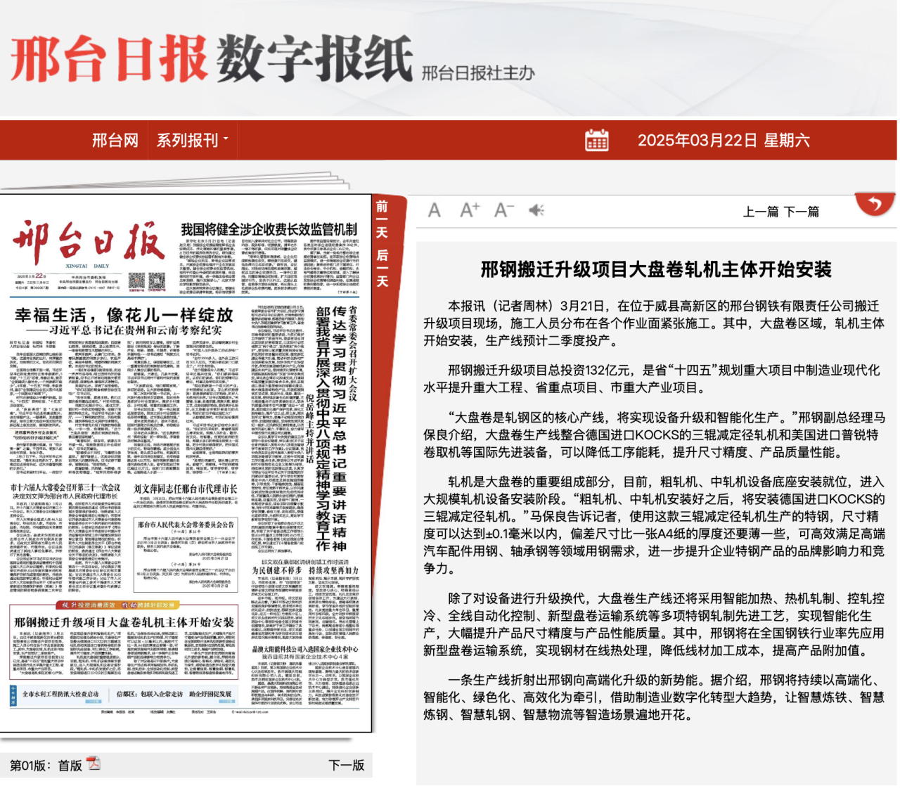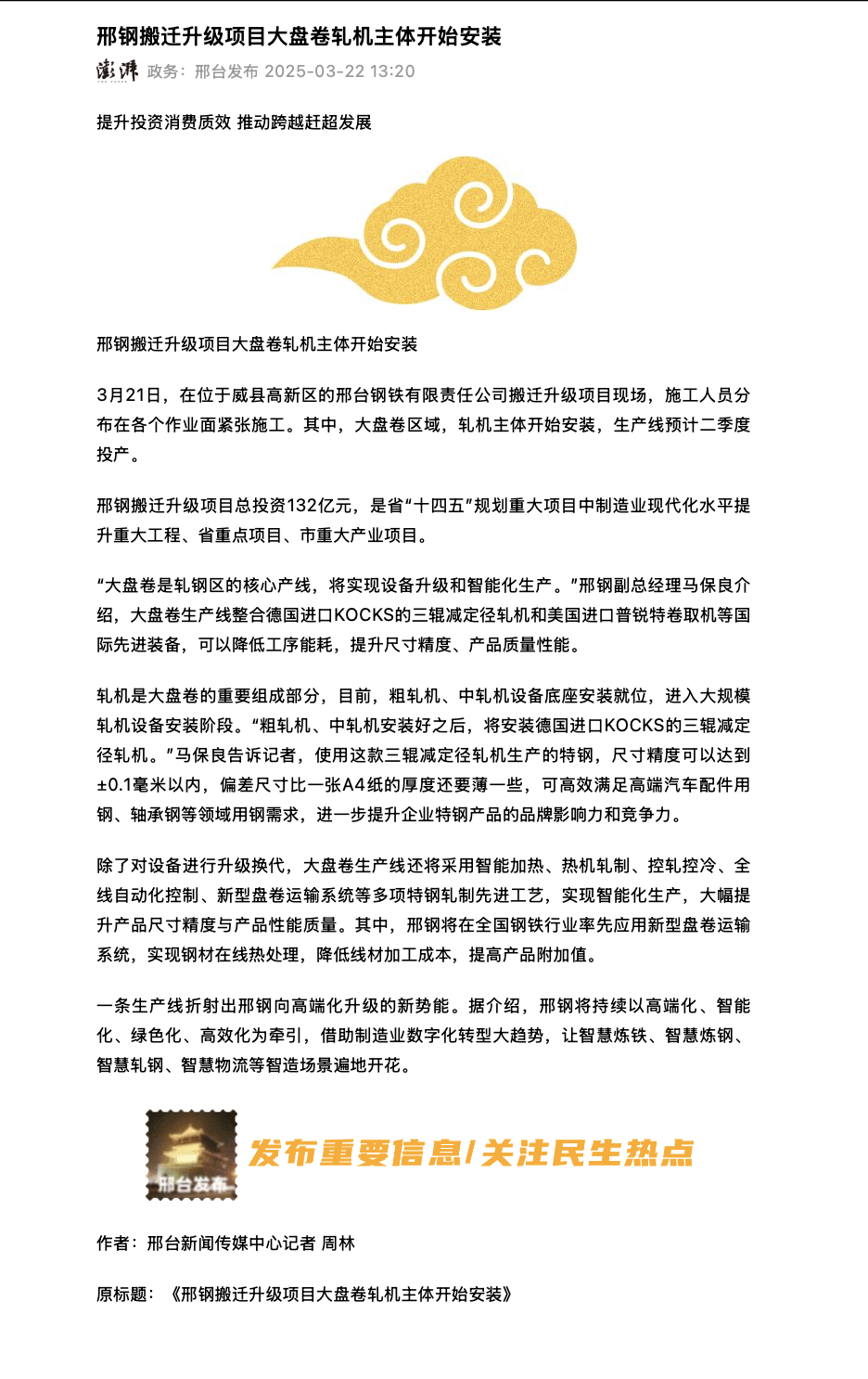 邢鋼搬遷升級項目總投資132億元,是省“十四五”規(guī)劃重大項目中制造業(yè)現(xiàn)代化水平提升重大工程、省重點(diǎn)項目、市重大產(chǎn)業(yè)項目。 “大盤卷是軋鋼區(qū)的核心產(chǎn)線,將實現(xiàn)設(shè)備升級和智能化生產(chǎn)。”邢鋼副總經(jīng)理馬保良介紹,大盤卷生產(chǎn)線整合德國進(jìn)口KOCKS的三輥減定徑軋機(jī)和美國進(jìn)口普銳特卷取機(jī)等國際先進(jìn)裝備,可以降低工序能耗,提升尺寸精度、產(chǎn)品質(zhì)量性能。