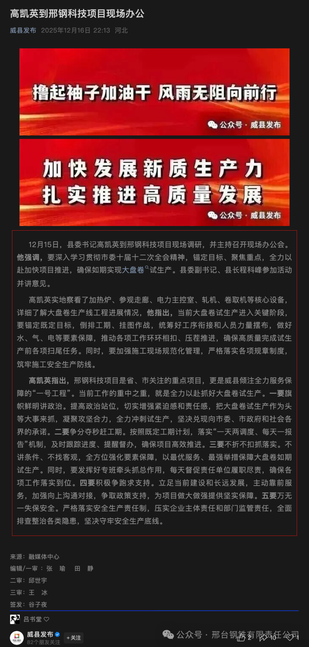 高凱英指出,邢鋼科技項(xiàng)目是省、市關(guān)注的重點(diǎn)項(xiàng)目,更是威縣傾注全力服務(wù)保障的“一號(hào)工程”。當(dāng)前工作的重中之重,就是全力以赴抓好大盤卷試生產(chǎn)。一要旗幟鮮明講政治。提高政治站位,切實(shí)增強(qiáng)緊迫感和責(zé)任感,把大盤卷試生產(chǎn)作為頭等大事來(lái)抓,凝聚攻堅(jiān)合力,全力沖刺試生產(chǎn),堅(jiān)決兌現(xiàn)向市委、市政府和社會(huì)各界的承諾。二要爭(zhēng)分奪秒趕工期。按照既定工期計(jì)劃,落實(shí)“一天兩調(diào)度、每天一報(bào)告”機(jī)制,及時(shí)跟蹤進(jìn)度、提醒督辦,確保項(xiàng)目高效推進(jìn)。三要不折不扣抓落實(shí)。不講條件、不找客觀,全方位強(qiáng)化要素保障,以最優(yōu)服務(wù)、最強(qiáng)舉措保障大盤卷如期試生產(chǎn)。同時(shí),要發(fā)揮好專班牽頭抓總作用,每天督促責(zé)任單位履職盡責(zé),確保各項(xiàng)工作落實(shí)到位。四要積極爭(zhēng)跑求支持。立足當(dāng)前建設(shè)和長(zhǎng)遠(yuǎn)發(fā)展,主動(dòng)靠前服務(wù),加強(qiáng)向上溝通對(duì)接,爭(zhēng)取政策支持,為項(xiàng)目做大做強(qiáng)提供堅(jiān)實(shí)保障。五要萬(wàn)無(wú)一失保安全。嚴(yán)格落實(shí)安全生產(chǎn)責(zé)任制,壓實(shí)企業(yè)主體責(zé)任和部門監(jiān)管責(zé)任,全面排查整治各類隱患,堅(jiān)決守牢安全生產(chǎn)底線。